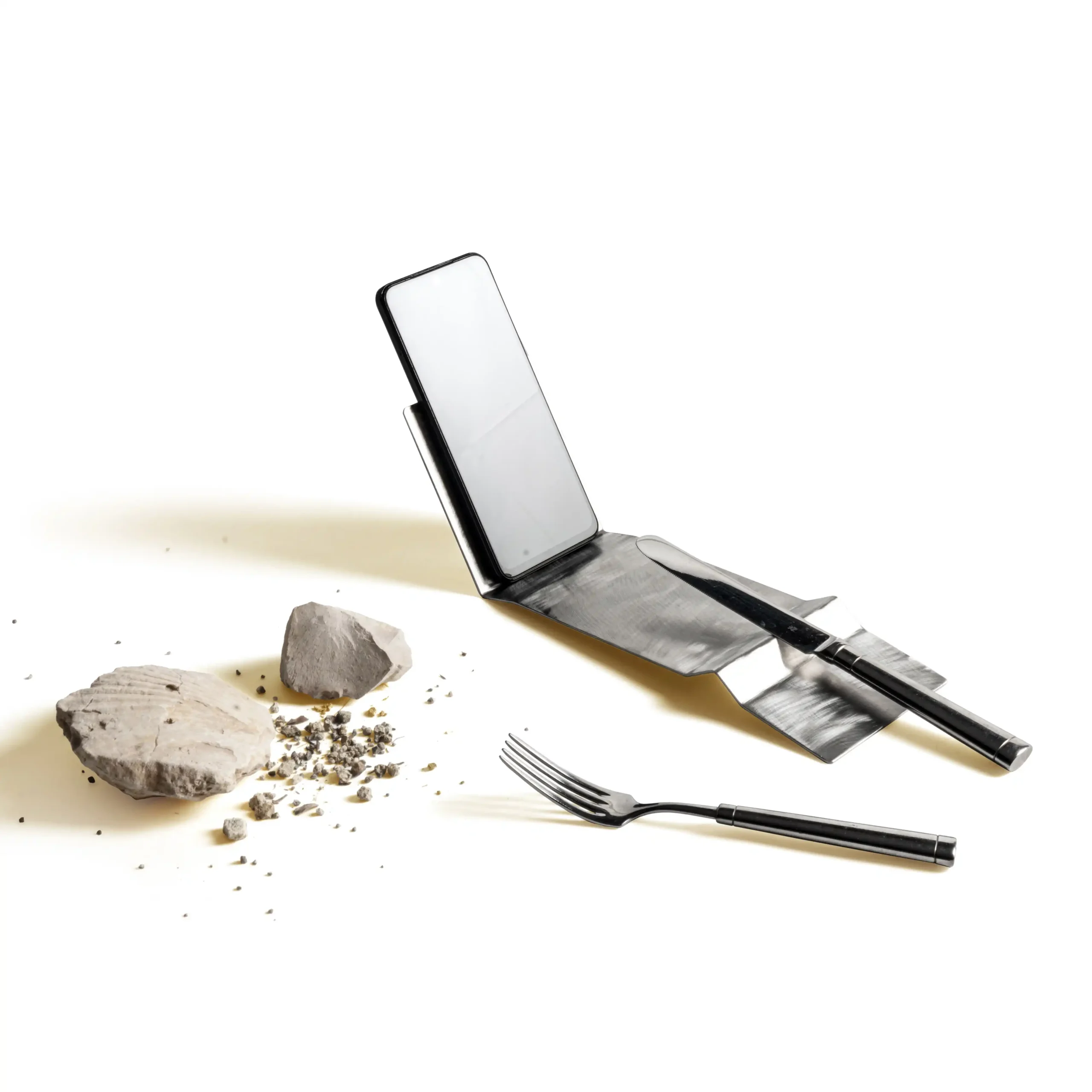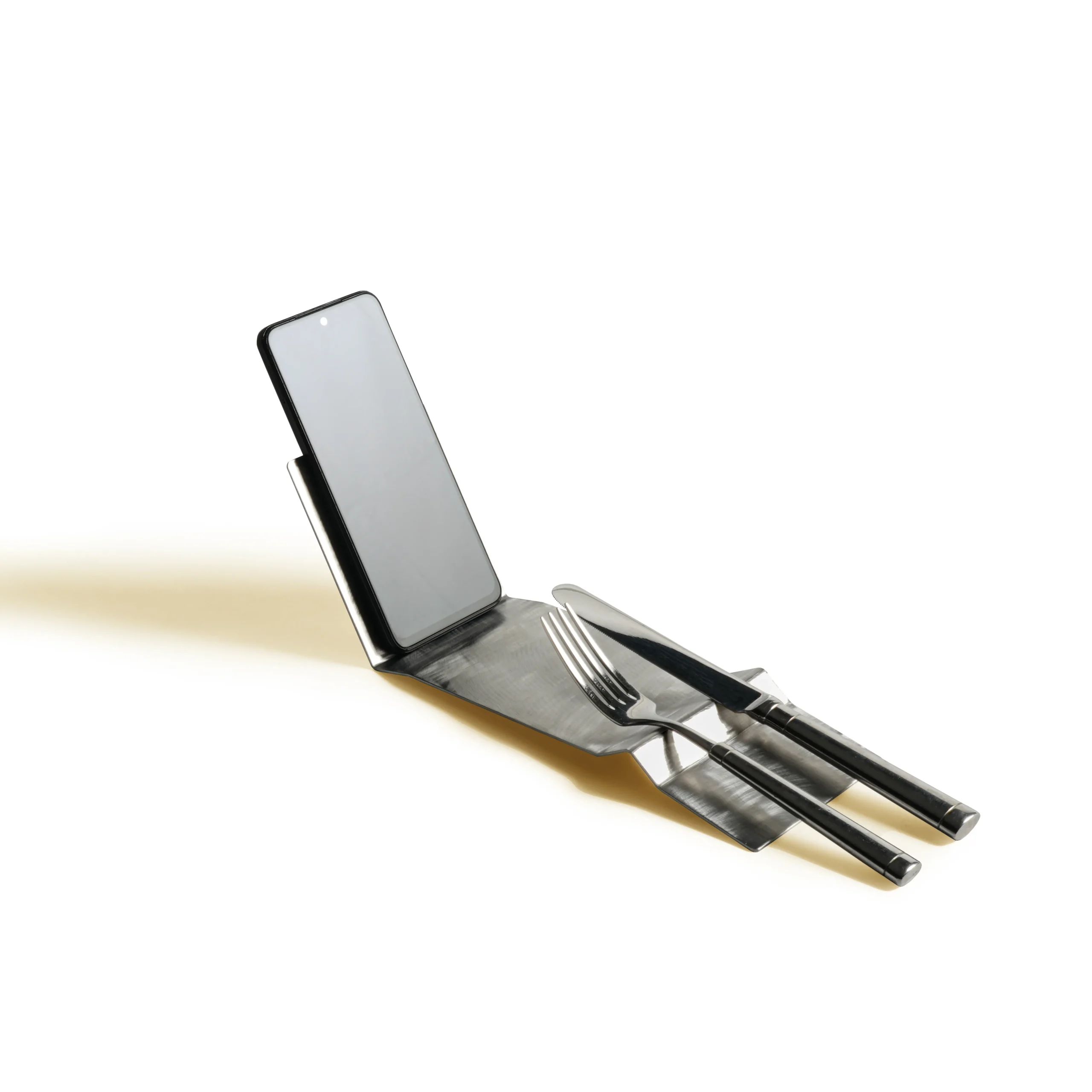 Poggiaposate che “con apparente maleducazione” determina una nuova regola per la mise en place. Infatti, oltre alla canonica funzione, Maleducatə integra lo smartphone tra gli strumenti della tavola. In due finiture: Maleducato in acciaio satinato e Maleducata in acciaio spazzolato.