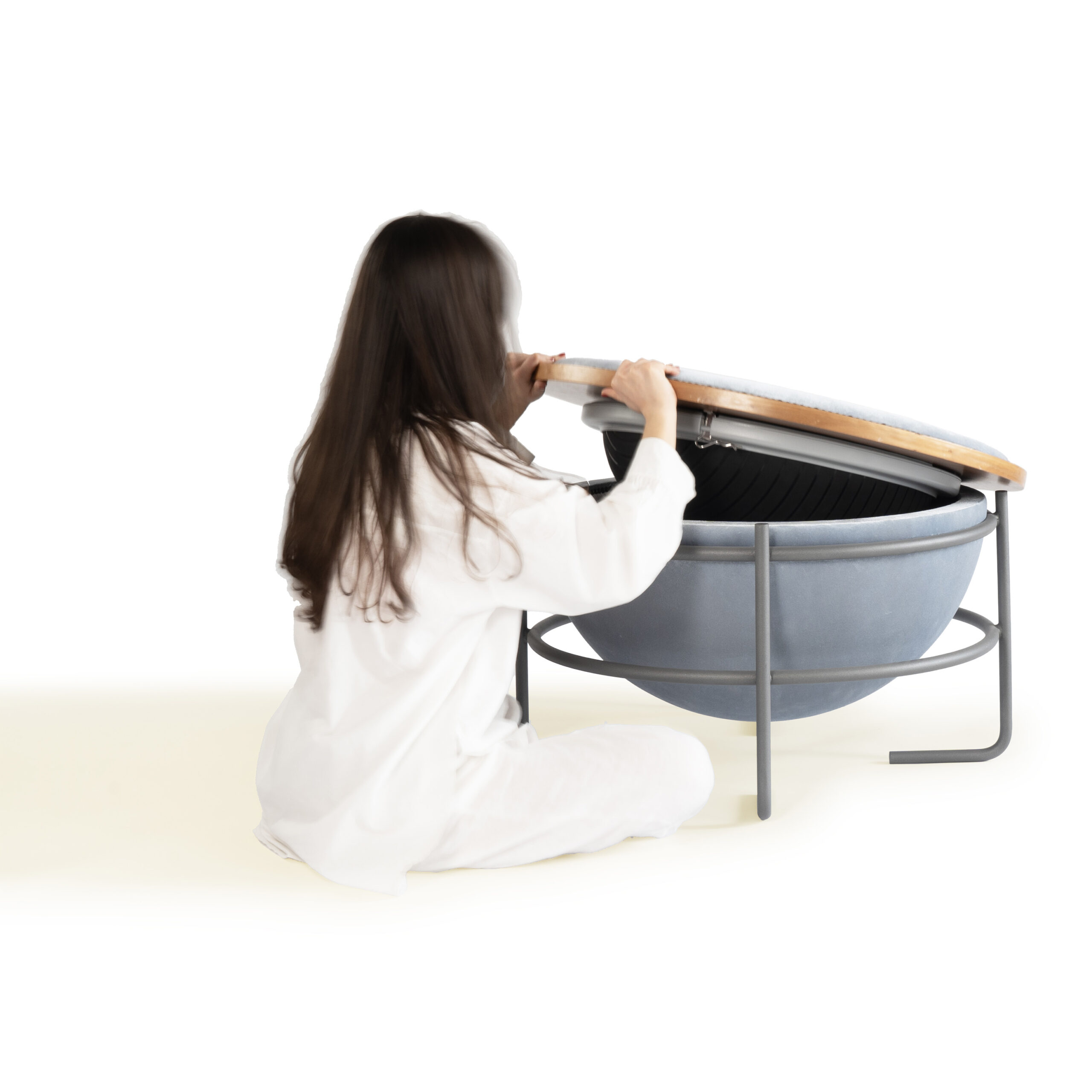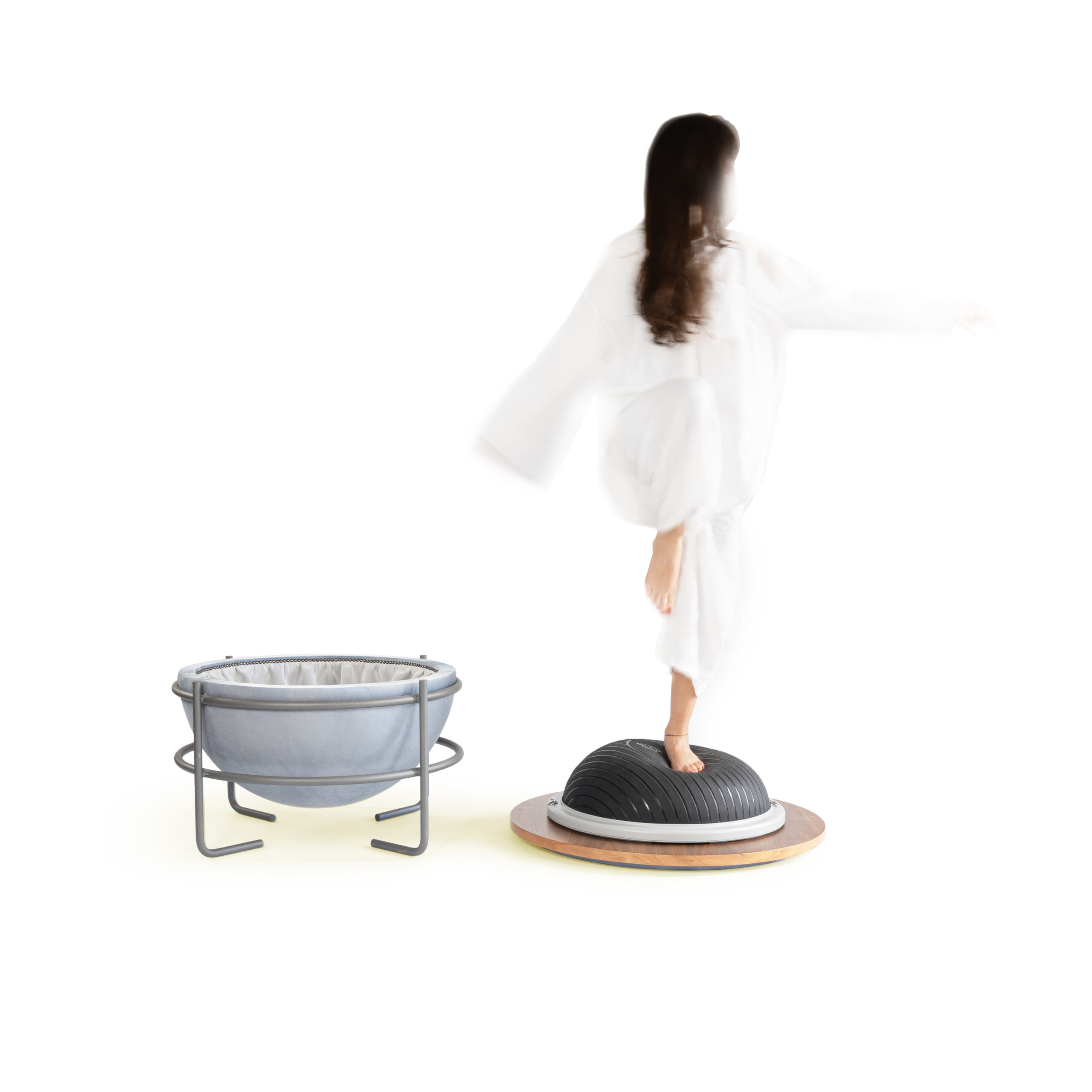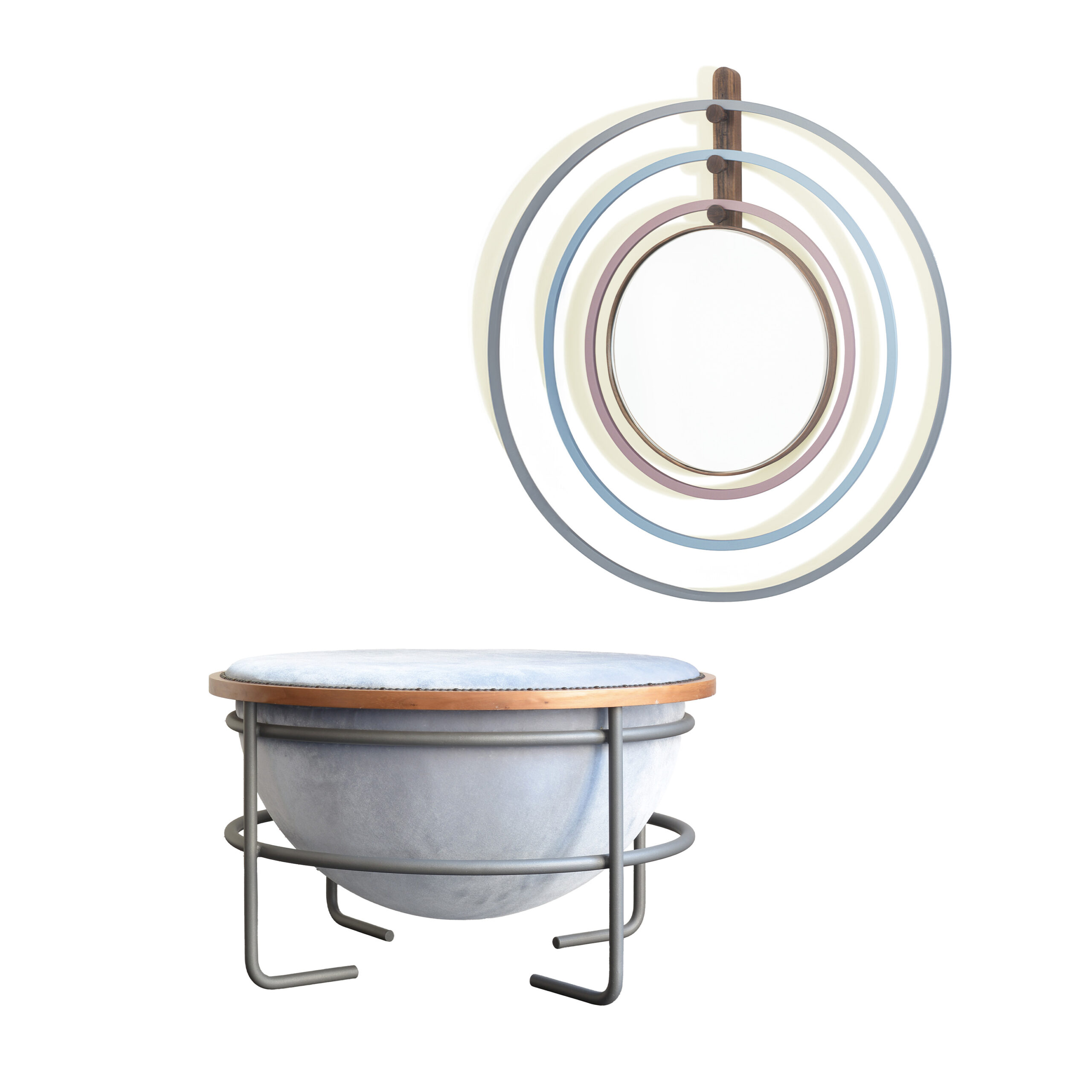 M’ama Collection è un sistema ibrido, tra complemento d’arredo e strumento per il fitness. È composto da un pouf che nasconde una semisfera da pilates e da uno specchio con tre hula hoop di grandezza crescente, per adulti e bambini.