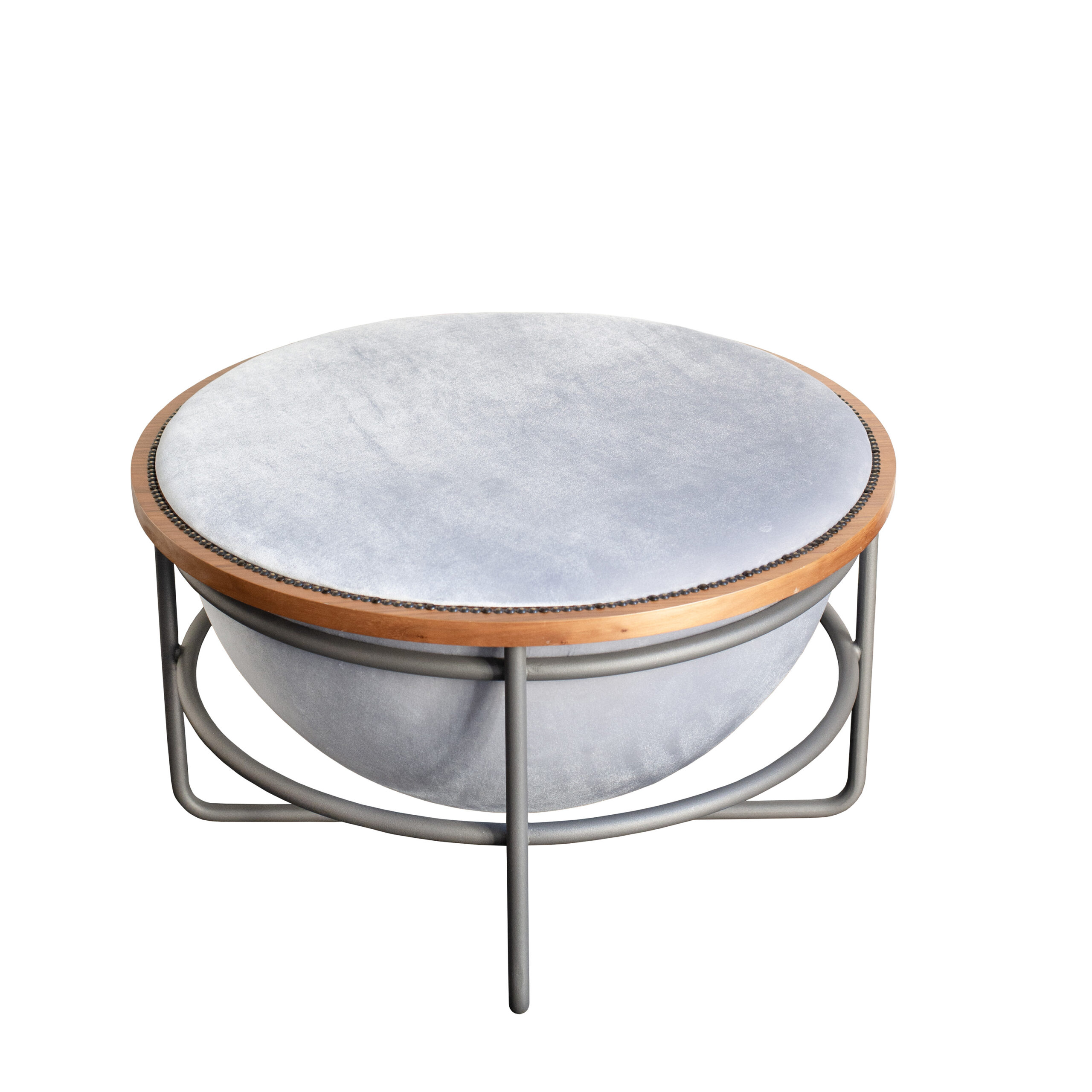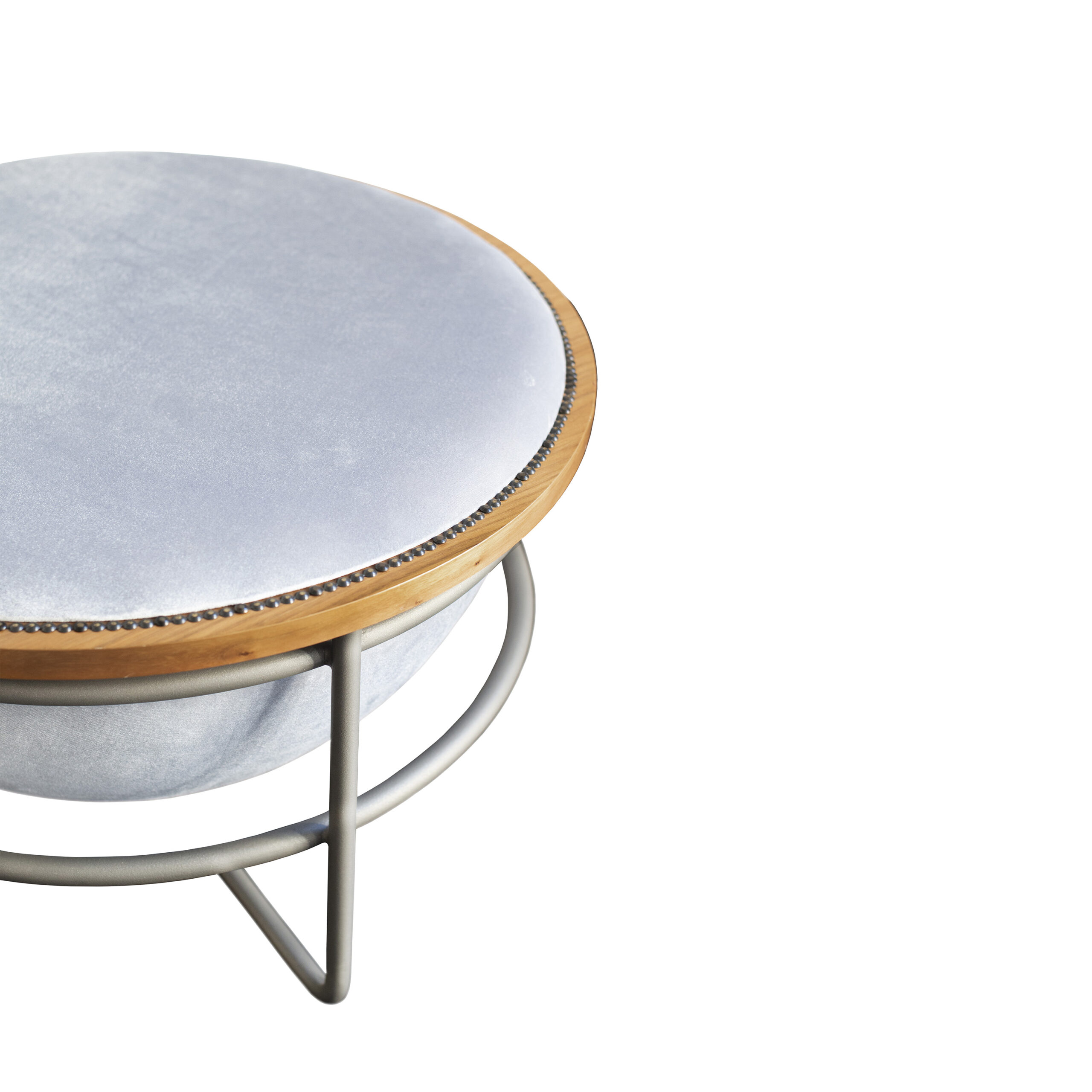Pouf: struttura in ferro verniciato a polvere con finitura grinzata, cornice seduta in noce canaletto, sfera e seduta in velluta bielastico, sfera Technogym®.