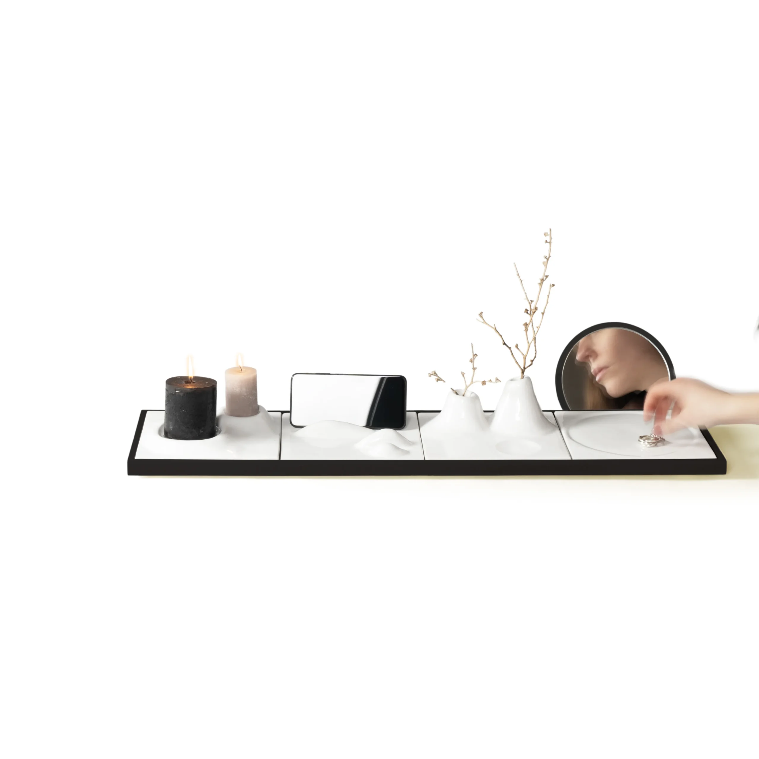 Misguardo è il terreno fluido sul quale costruire le nuove liturgie della beauty routine. Quattro paesaggi e differenti geografie. Quattro moduli ceramici che, tra dune e incavi, invitano a costruire i propri riti del benessere quotidiano.