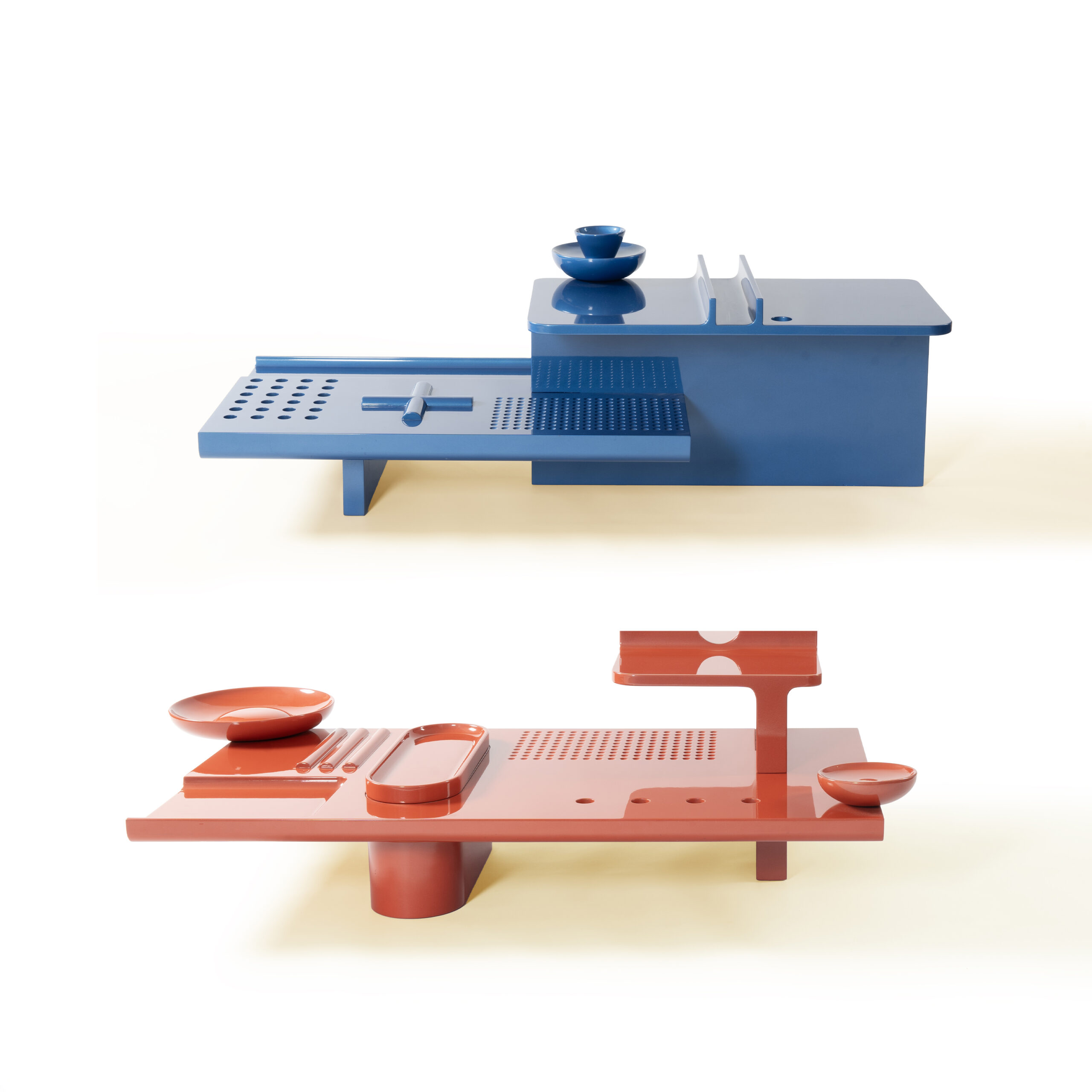 Coffee table enigmatici e scultorei che svelano poco a poco le loro molteplici funzioni: per guardare un film o lavorare al computer, scrivere, disegnare e mangiare. Le loro superfici, tra incavi e smussi, suggeriscono come predisporre gli oggetti.