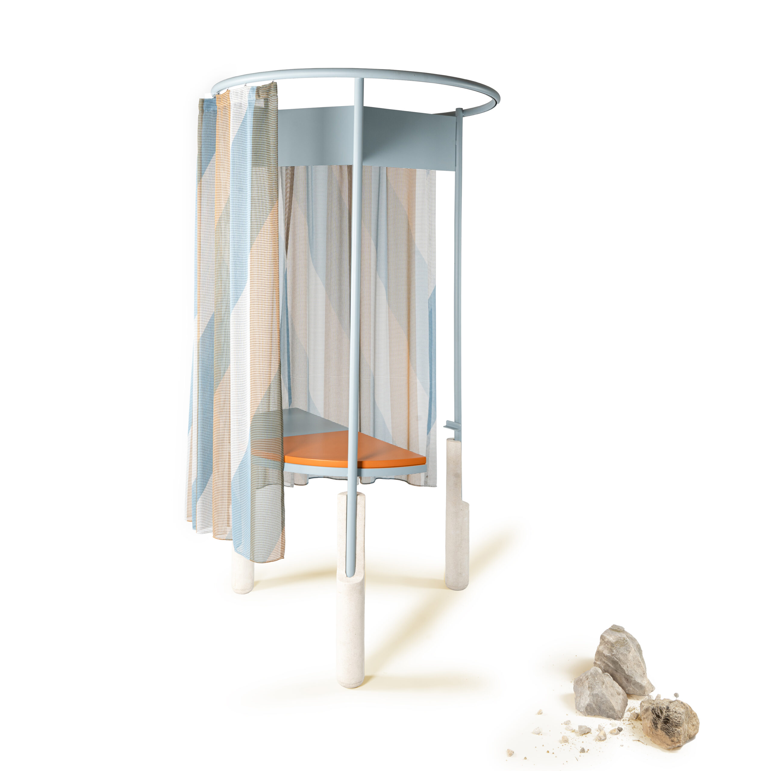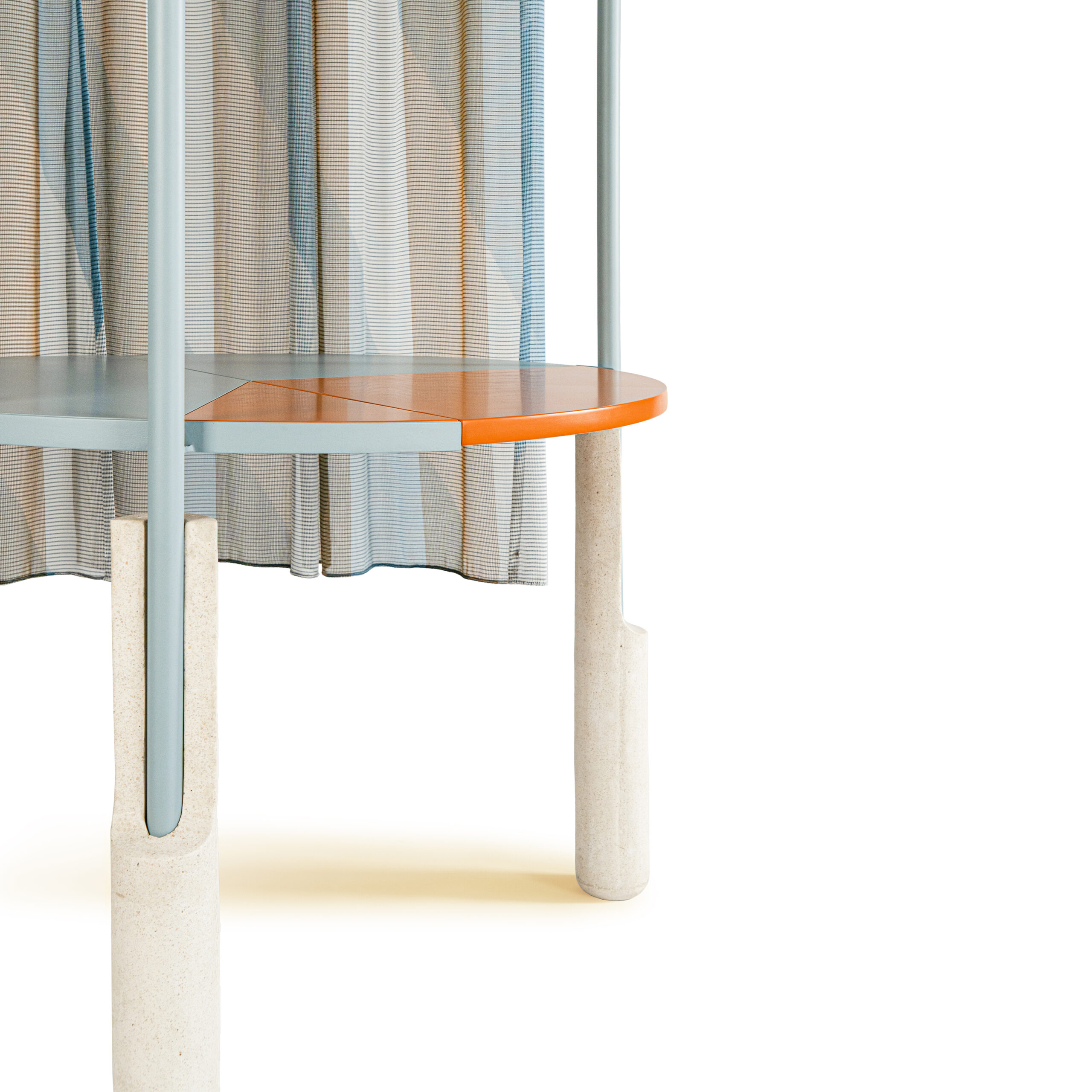 Struttura in ferro verniciato con finitura opaca, top in MDF laccato con finitura opaca, tende in tessuto semitrasparente sintetico. Adatto all’utilizzo outdoor.