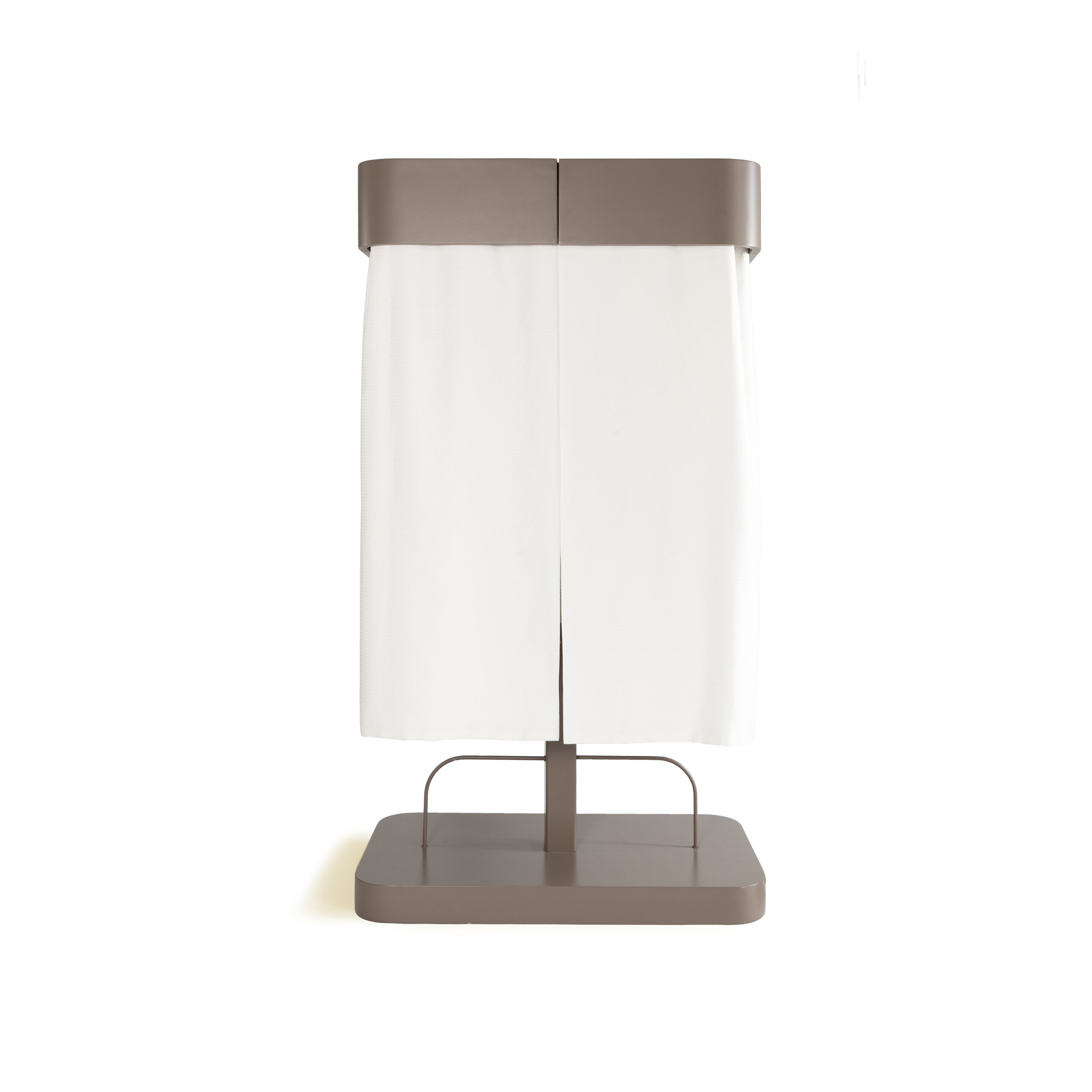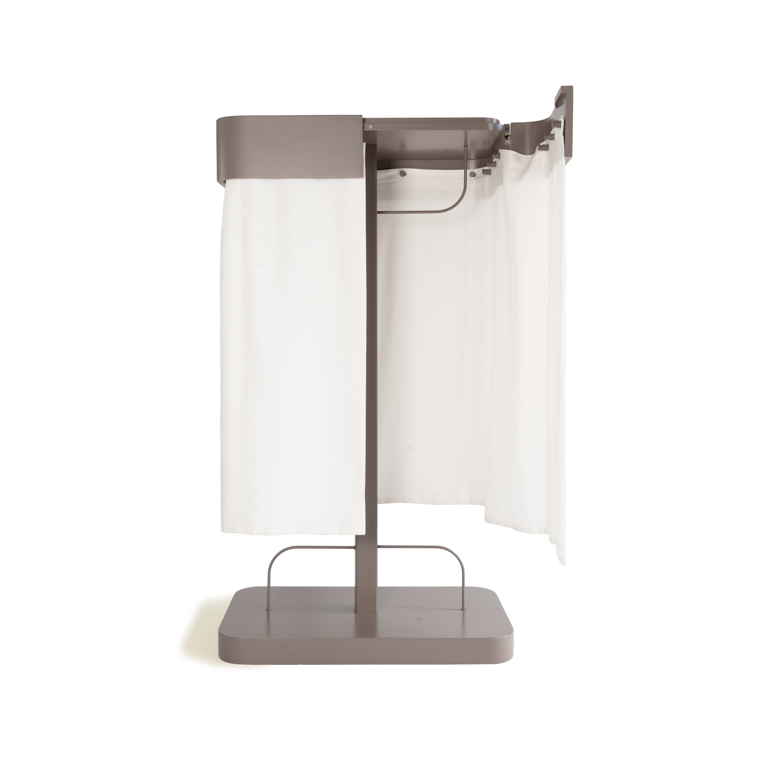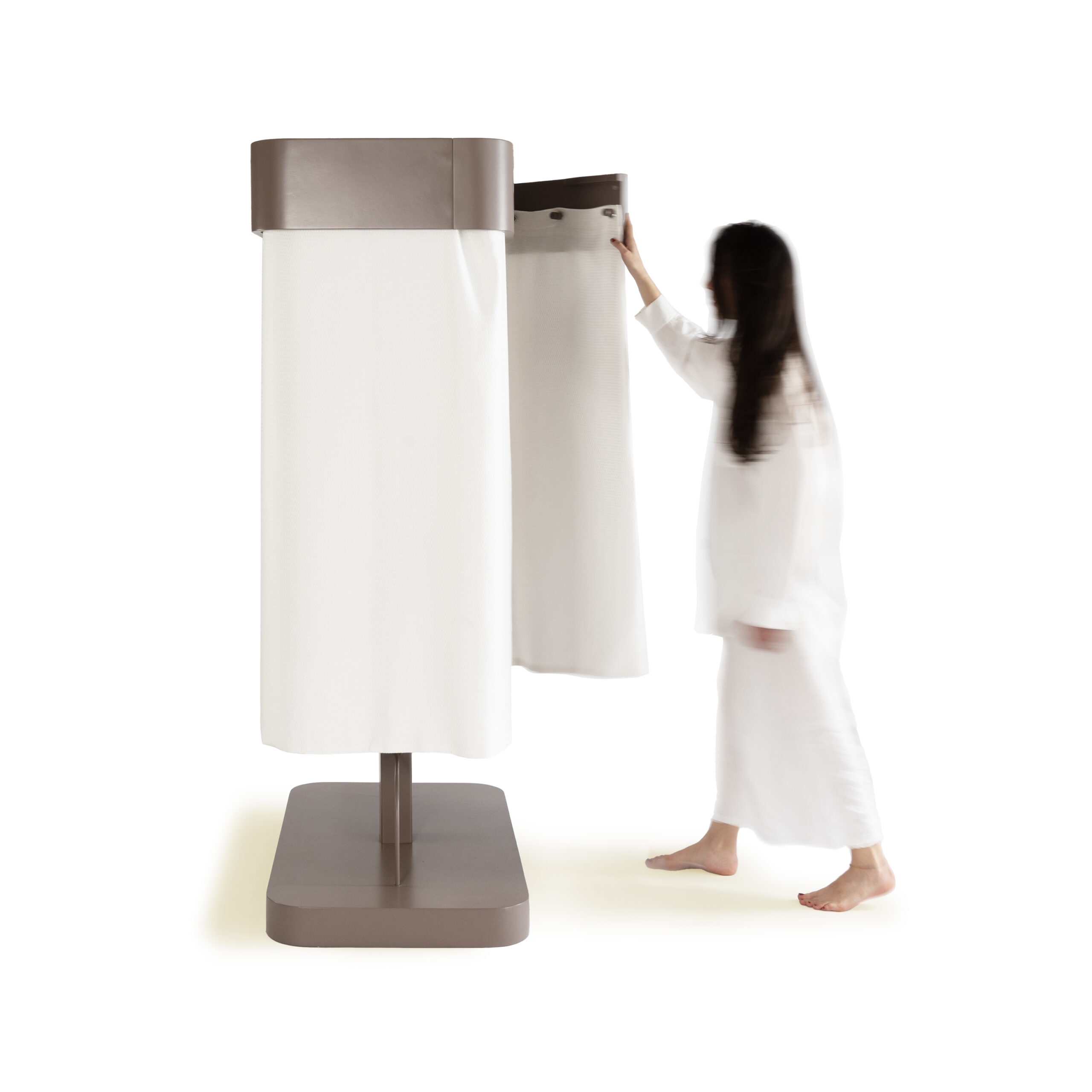 Legno laccato con finitura opaca, gruccia in ferro verniciato con finitura opaca, tenda tessuto in Kinnasand® o Orangfiber®.